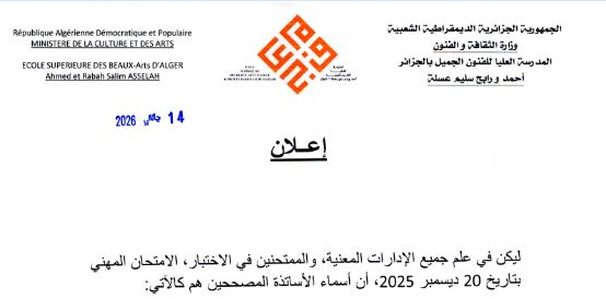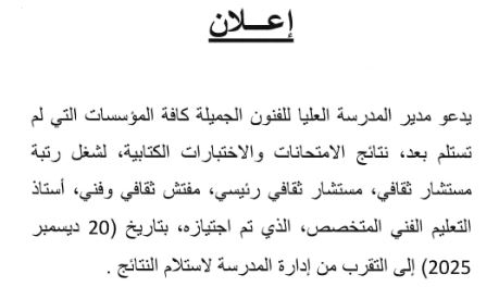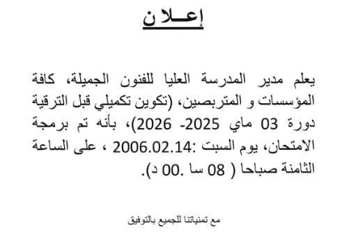 تعلن المدرسة العليا للفنون الجميلة لفائدة المستشاريين الثقافيين التكوين التحضيري اثناء فترة التربص والتكوين التكميلي قبل الترقية ان الحصة المبرمجة ليوم 14 جوان 2025 ملغاة الى اجل اخر
