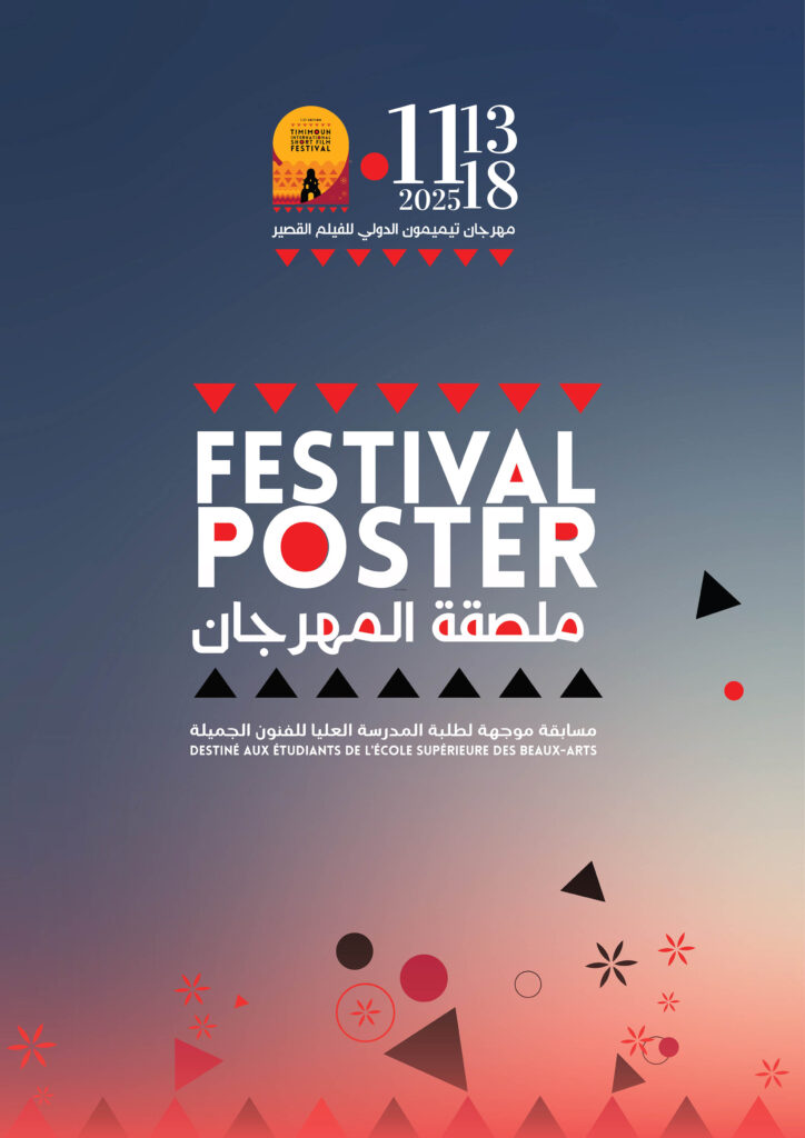 استعدادا للدورة الأولى من مهرجان تيميمون الدولي للفيلم القصير، المزمع تنظيمه من 13 إلى 18 نوفمبر 2025، تعلن محافظة المهرجان عن إطلاق مسابقة أحسن ملصقة رسمية للتظاهرة، الموجهة خصيصًا إلى طلبة مدارس الفنون الجميلة وملاحقها عبر الوطن.
