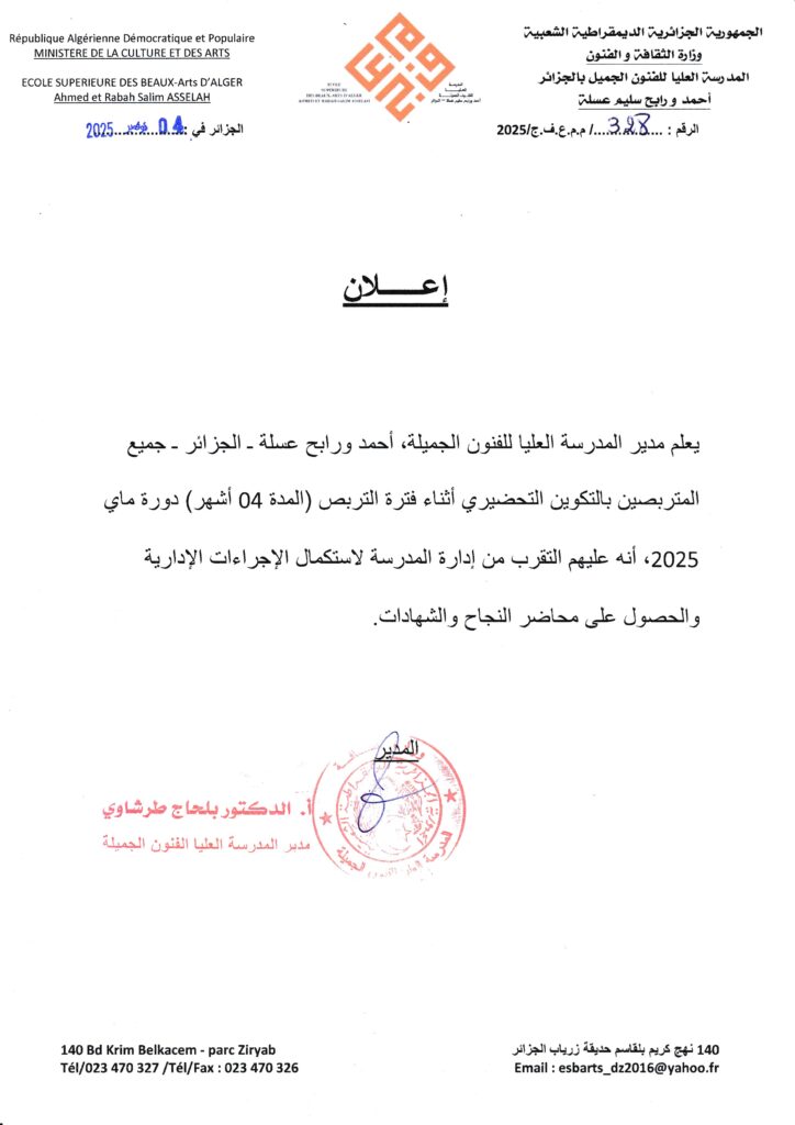 © 2004-2025 Ecole Supérieure des Beaux-arts d'Alger. Tous droits réservés.