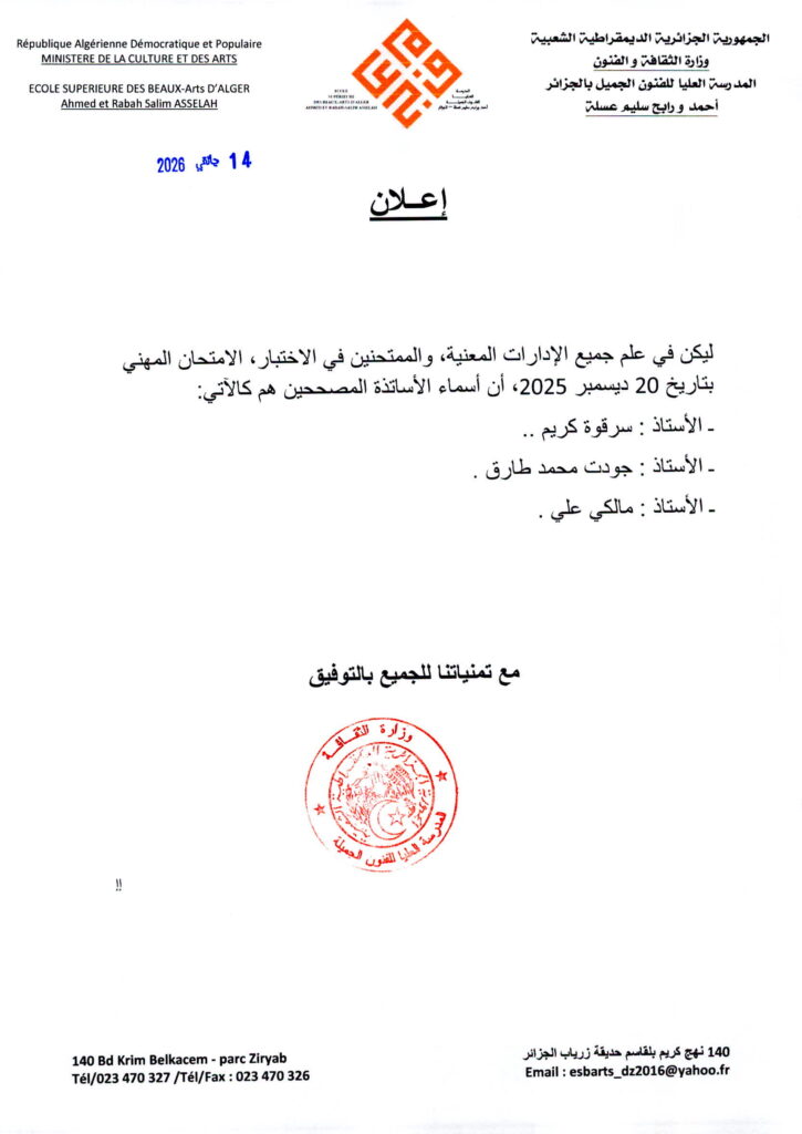 © 2004-2026 Ecole Supérieure des Beaux-arts d'Alger. Tous droits réservés.